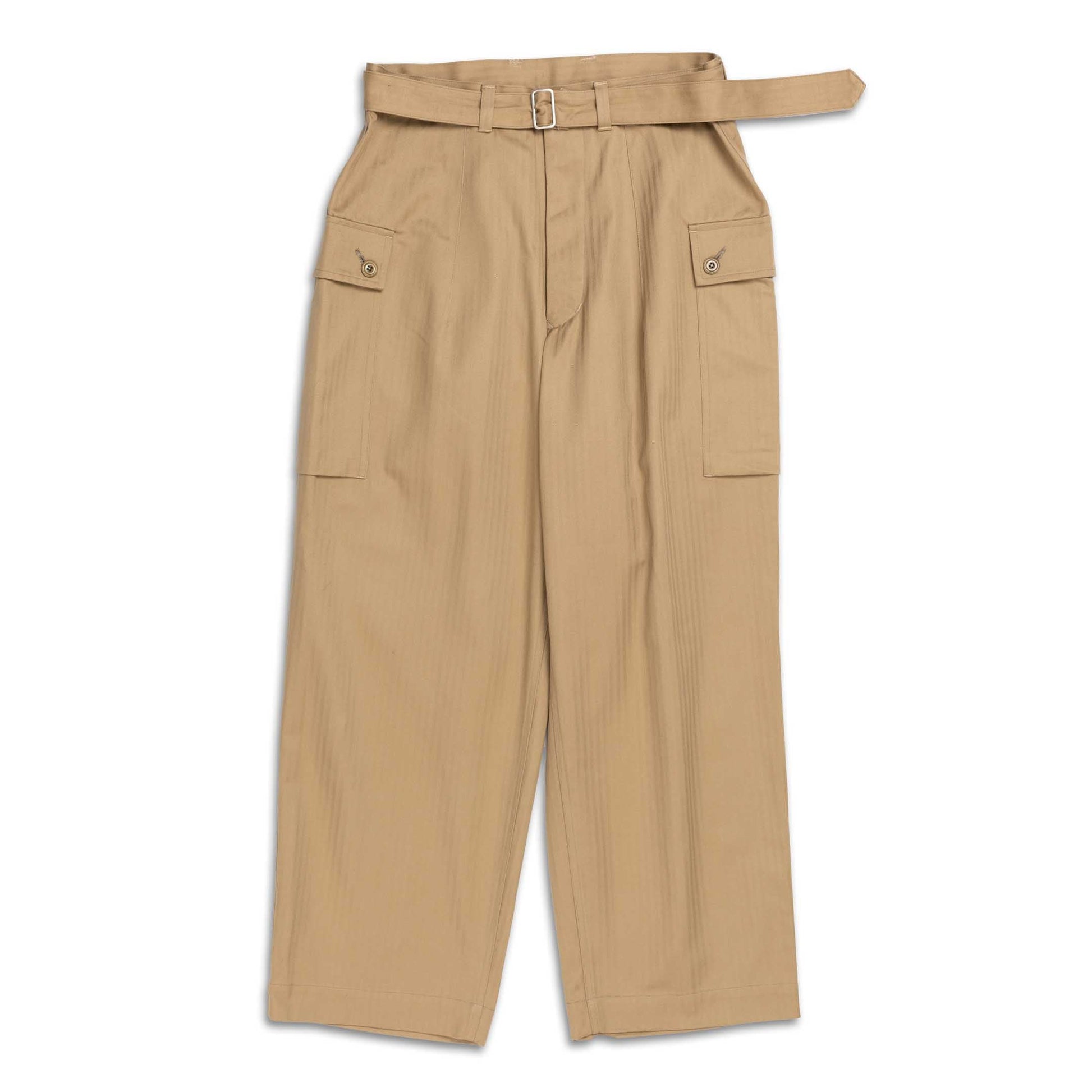 Heavily inspired by all elements of vintage clothing & design, Haversack incorporate components of military wear, workwear, dress & uniform to create a truly inspiring collection. Haversack's Utility Pants for this AW24 take inspiration from vintage US Military issue M-43 field trousers, used by US Army infantry units during WWII. These have been cut from 100% cotton in Japan, and feature a distinctive high density Herringbone twill throughout, while the trousers utilise a deep, high rise and a straight silhouette with deep darts to the front. Highly functional, they feature two large pockets to either side with button flap closure, as well as a single gusseted pocket to the rear. A belted waist closure completes the look on these military inspired trousers. 100% cotton Based on M-43 trousers issued to US Army High rise Straight silhouette w/deep darts to the front Two large pockets to either side w/button flap closure Single gusseted pocket to the rear Belted waist Made in Japan
