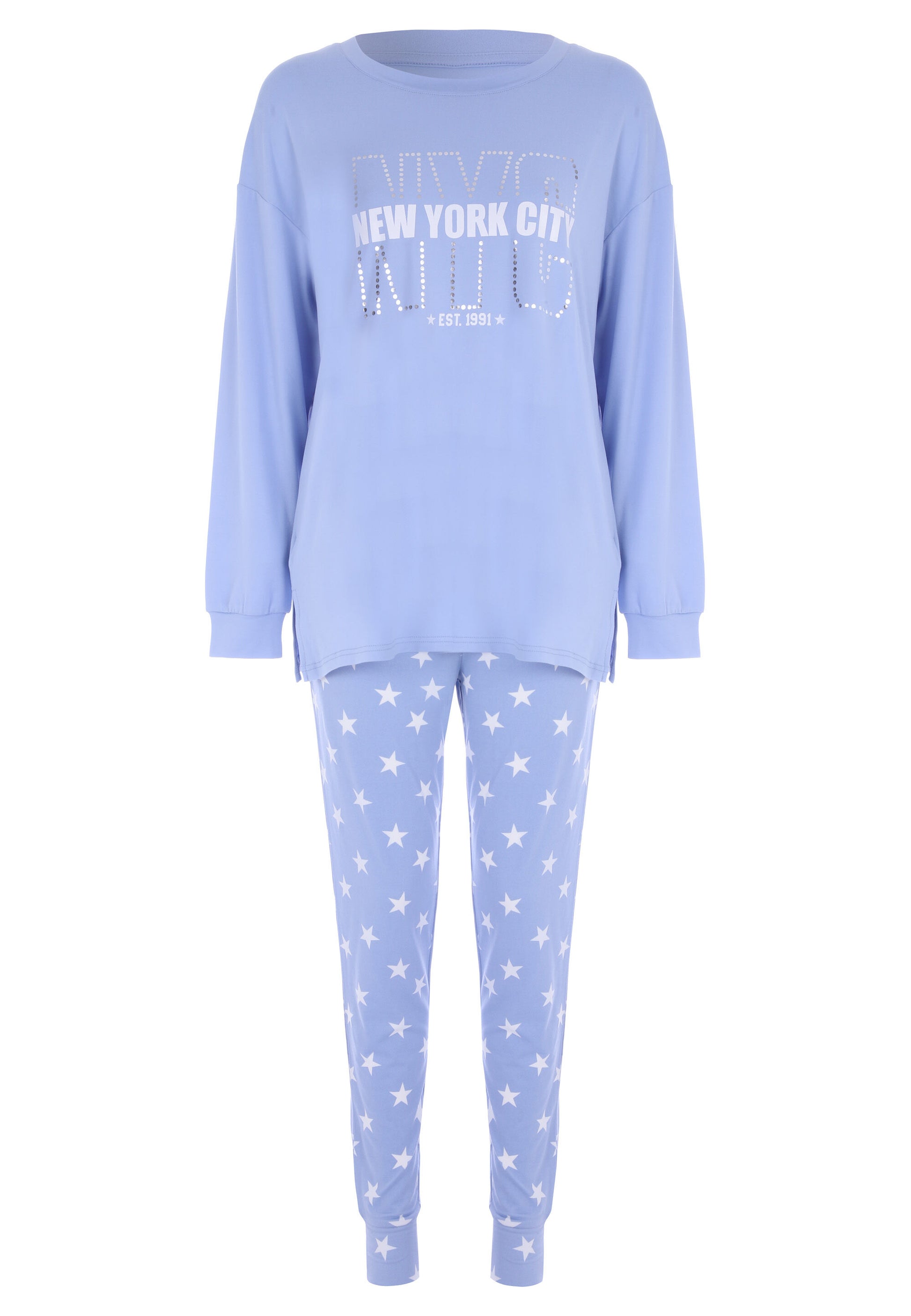 Stay cosy this season in this lovely womens pyjama set. In a soft touch blue material featuring a 'NYC' graphic print top with crew neckline and long sleeves plus coordinating star print full length bottoms with elastic waistband.